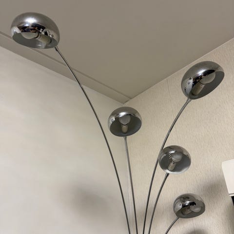 Hopeinen lattiavalaisin, jossa varjostinosa tehty riippuvista ketjuista (kuva 2). Kolme polttimoa.