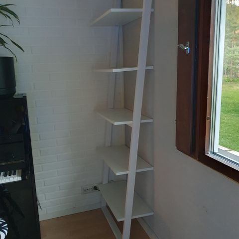 Myydään valkoinen puinen tikashylly, neljä tasoa, ylin taso 19cm syvä ja alin 30cm eli alaskäsin mentäessä isommat hyllyt.