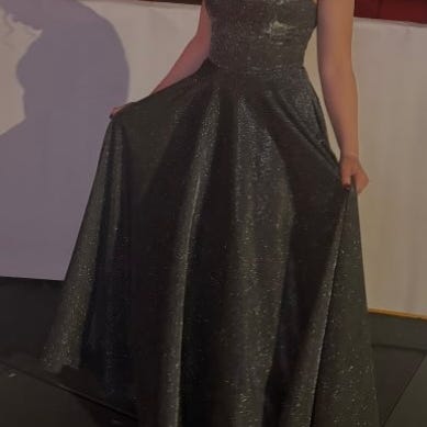 Musta glittermekko nyörltetyllä korsettimaisella yläosalla. Hienosti laskeutuva helma. Tanssikenkänä ollut tennarit, tanssija 172cm.