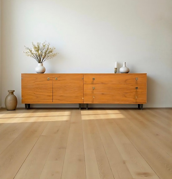 Pitkä ja matala vintage teak senkki, jossa kaksi kaappia.