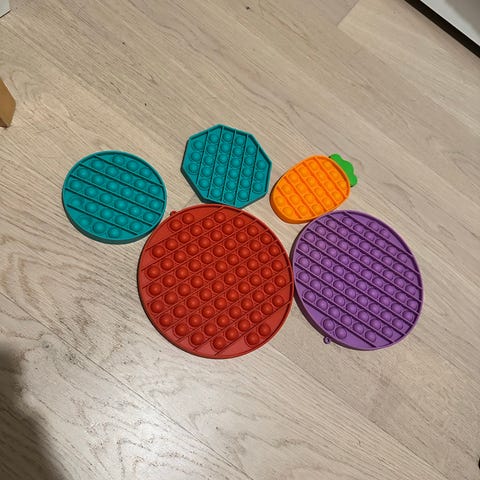 Kuvassa näkyvät pop- it lelut ja fidgetit uuteen kotiin. Osa leluista on käyttämättömiä.