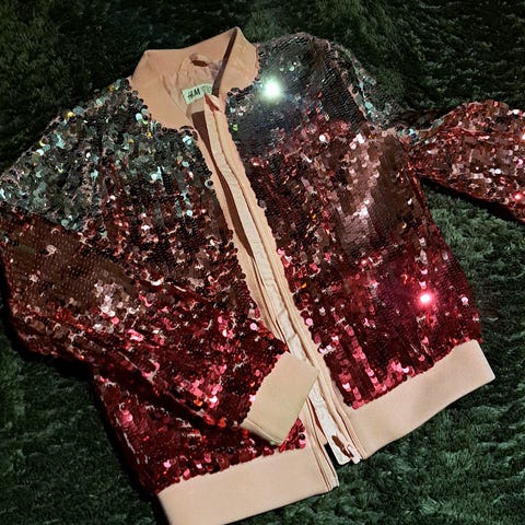 Kaunis turkoosi paljettijakku. Koko virallisesti 9-10v, meillä käytössä 128/134 kokoisella.