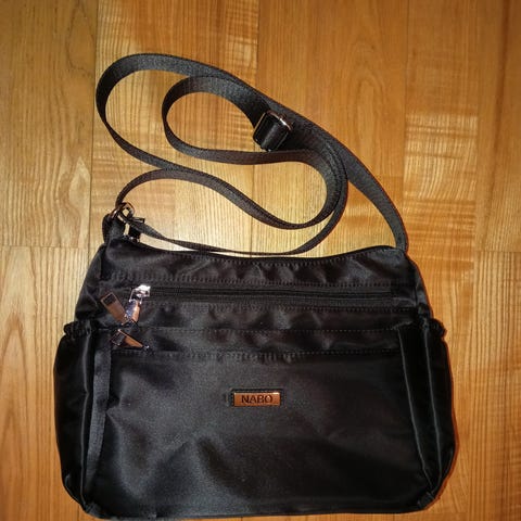 Nowi siisti ja hyvin vähän käytetty olkalaukku n. 41 x 30 x 11cm eli mahtuu mukavasti lentokoneessa penkin alle, joskin suurin mitta menee juuri yli 40cm rajan. Kovikkeet pitkillä sivuilla, mutta ei pehmusteita. Yksi pieni reikä takana, näkyy toisessa kuvassa vasemmalla alaosan sivureunassa.