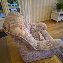 Nojatuolissa edellinen omistaja on kunnostanut tuolia mm. Päällystämällä uudelleen valkoisella, pilkullisella kankaalla. Kangas on melko siistissä kunnossa, pientä tahraa saattaa löytyä, mutta kauttaaltaan ehjä. Käsinojat on maalattu mustaksi. Toinen käsinoja irronnut, mutta kinnitettävissä takaisin.