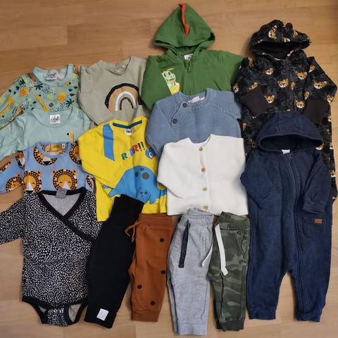 Koon 62 vaatepaketti. Haalareita, pipoja, neuletakki, villasukkia, tumput.. kaikki hyvässä kunnossa. Vaalea karhuhaalari on uusi.