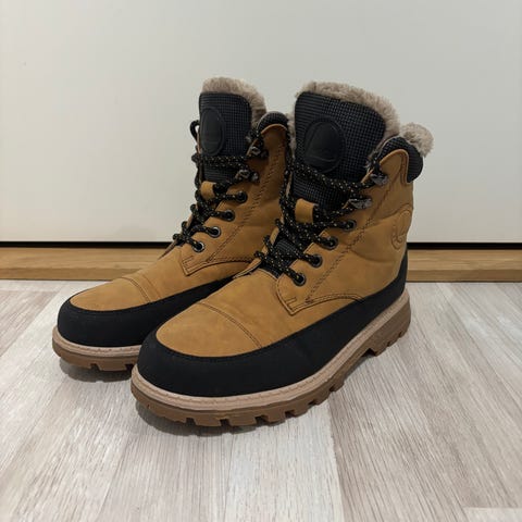 Lämpimät ja vedenpitävät. Tosi hyvät jalassa. Vain muutamia kertoja nuori käyttänyt ennen kuin jäi pieneksi.