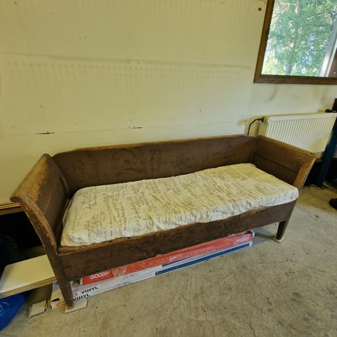 Soma täyspuinen sohva, jossa beigen värinen, kirjava verhoilu. Kaksi mahtuu istumaan leveästi. Verhoilu on ehjä ja sohva kaikinpuolin siistissä kunnossa. Istuinosassa on vain ohut pehmuste. Toisessa käsinojassa on saumakohta raollaan, mutta ei haittaa käyttöä. Uudelleen verhoilemalla tästä saa todellisen silmäkarkin! Ollut koirakodissa.