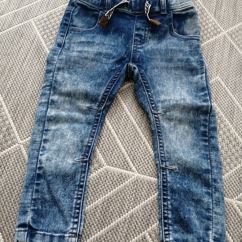 Hyväkuntoiset farkut koossa 92cm. Joustava vyötärö, pehmeää ja joustavaa kangasta. Muutamat juhlat juhlittu. Jotain jälkeä lahkeensuissa sekä taskujen reunassa, jotka luultavammin olleet jo uudesta asti.