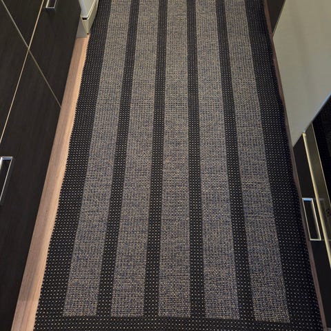 Uusi, upea, napakka grafiitinmusta +siniharmaa pystyraidallinen matto, käsinkudottu, 97x117