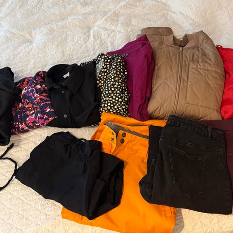 Paitoja, neuleita, parit farkut, t-paitoja/toppeja, mekkoja, shortseja, hameita, jne.