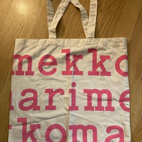 Marimekko kangaskassi, jossa on punaiset kukkakuvioinnit ja musta teksti. Materiaali on kangasta, ja kassi on varustettu kahvoilla kantamista varten. Sopii arkipäiväiseen käyttöön ja kestävään kantamiseen.