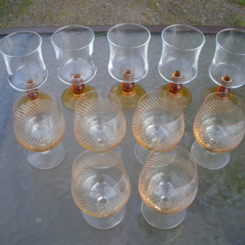 Kuvan sirot ja ehjät viinilasit yhteishintaan. Vetoisuus n. 1 dl. Nouto Karhunmäestä tai postikulut ostajalle.