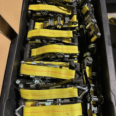 Setti erilaisia käyttämättömiä kuormankiinnitysliinoja.