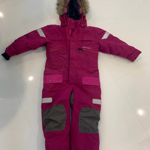 Didriksons lasten haalari, koko 90. Aniliininpunainen. Käytetty kunto, mutta ehjä. Peppu ja polvet ehjät, pehmeyttä näillä alueilla kankaassa. Puntit ja hiat ehjät, hieman tummentumaa.