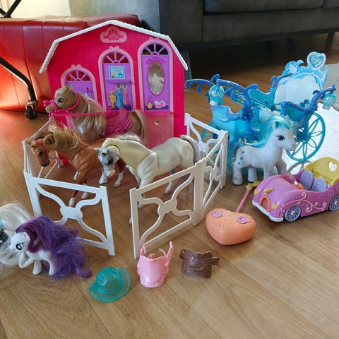 Joukossa Barbie hevonen (beige/ruskea harja), Baby Born minis horse (beige/ pieni), Fisher Price Loving Family Dollhouse Haley Comet ja Simba poni (sininen). Lisäksi satula.