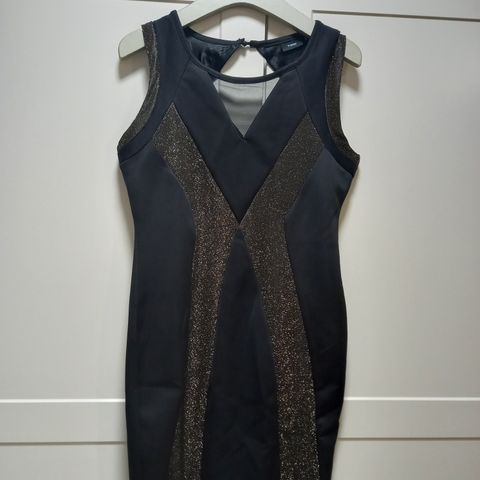 Musta/vaalea beesi -värinen mekko, vyötäröllä oikealla ryöpytys, pieni halkio helmassa.