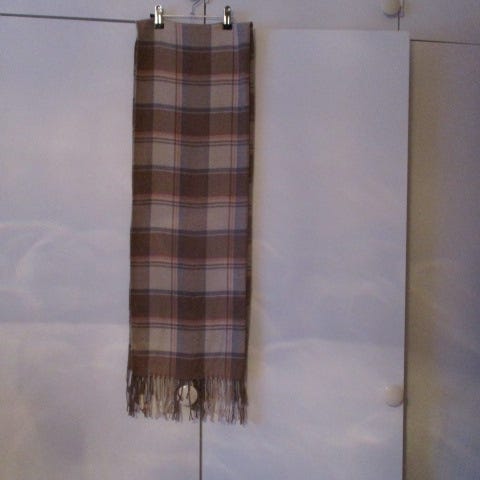 Pitkä, pehmoinen kaulahuivi 67 cm x 197 cm ja hapsut. Punaharmaa kuviointi. Pm. 8e