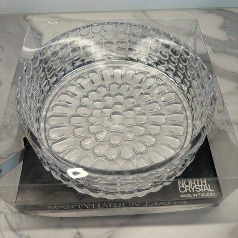 Eero Rislakin Mäntyharjun Lasille suunnittelema tarjoilulautanen. Lautanen on alkuperäispaketissa ja lyijykristallia. On siis painava. Lilan värinen.