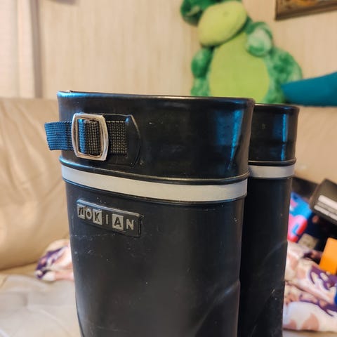 Tosi vähäisellä käytöllä olleet klassikot keltaiset nokian hai kumisaappaat. Mitään moitittavaa en löytäny, eikä saappaat ole vanhat joten kumi ei ole haurastunut. Vastaa kokoaan 37, sisäpohjallisen mitta n.24cm joten kenkään mahtuu hyvin myös villasukka. Pitää täysin vettä (testattu).