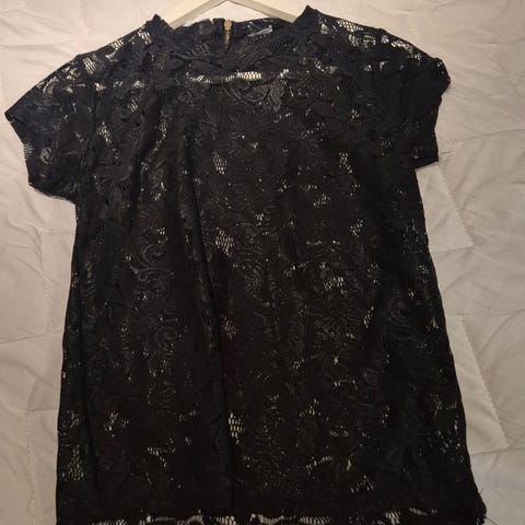 Musta hopeanhohtoinen läpinäkyvä pitsipaita. Merkkiä en muista, koska olen leikannut lapun pois.