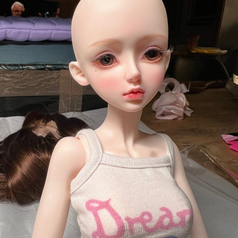 Echo Town Delores 1/4 kokoinen bjd nukke. Väri on hieman kellastunut normal, ja keho uudempi versio. Kuvassa näkyvä peruukki on liimattu päähän, mutta pään saa silti helposti auki.