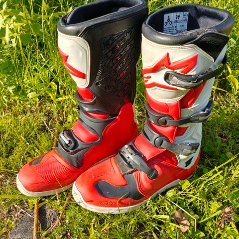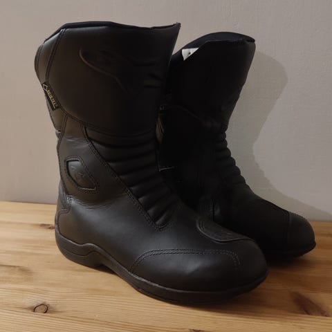 Alpinestars Tech 7 moottoripyöräsaappaat mustassa värissä. Saappaissa on neljä solkikiinnitystä ja ne ovat kokoa 38. Materiaali on kestävää ja suunniteltu suojaamaan jalkoja moottoripyöräajossa. Toisesta saappaista yksi solki rikki mutta ei vaikuta ajoa ja toisesta saappaista lähtenyt kärki metalli
