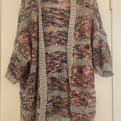 Kirjava neuletakki naisten S-koko. Neuletakki on valmistettu pehmeästä materiaalista ja siinä on raidallinen kuviointi. Sopii arkikäyttöön ja kerrospukeutumiseen.