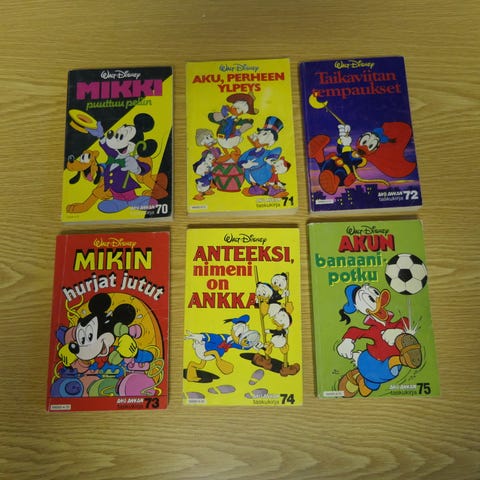 Joitain saattaa olla tuplat. Kunto vaihtelee, ei sata varmuutta että kaikissa olisi varmasti kaikki sivut ehjiä/ tallella, ei myöskään tietoa ettei olisi. Osa meille uutena tulleita, suurin osa käytettynä.