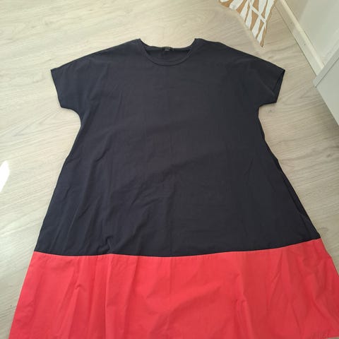 Hyväkuntoinen Cosin musta puuvillamekko. Tässä yhdistelty kahta kangasta. Yläosa hieman joustavaa t-paita materiaalia, edessä tätä kangasta kiila melkein alas asti. Sivutaskut paksumpaa puuvillakangasta. Takana paksumpi kangas aalkaa jo rintojen alapuolelta.