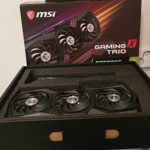 MSI Gaming X Trio RTX 3070, mukaan laatikko lisätukineen. Korttia ei ole avattu ja tahnoja vaihdettu.