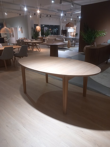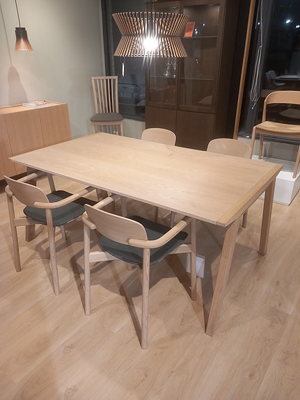 Valkoöljytty tammiviilu. Myymälän mallikappale. Pöytä on jatkettavissa yhdellä tai kahdella jatkolla. Kuvan tuolit myydään erikseen.