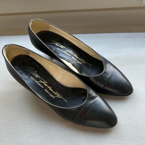 Mustat, hyväkuntoiset Pertti Palmrothin korolliset sandaalit, joissa on nilkkaremmi. Korko 8 cm. Koko on 5 1/2, mikä vastaa 38 1/2. Kengät olen hankkinut 1983 tai -84. Kengät ovat siistit.
