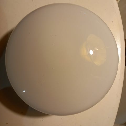 Vanha lasinen kattovalaisin. Halkaisija ylhäältä 24 cm. Korkeus 13 cm.