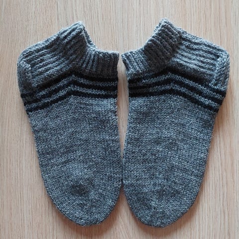 Miesten villasukkia, väreinä harmaa ja monivärisiä raitoja. Sukat ovat kokoa 44 ( terän pituus 30 cm), valmistettu lämpimästä 7-veljestä langasta. Varsi joustava, pituus n.30 cm. 1 parin hinta 15 e. Kuvassa olevat oikean puoleiset villasukat myyty.