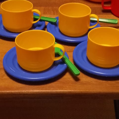 Plasto lasten leikkisetti (14 osaa), jossa 3 mukia, 3 lusikkaa, 3 lautasta, kannu kannella, kulho kannella kermakko (uutena n.10€)