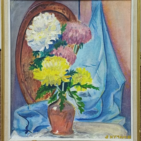 Vanha asetelma öljyvärimaalaus, ei signeerausta.