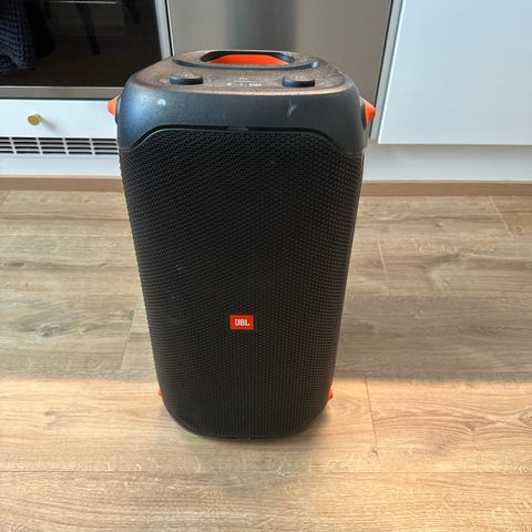 JBL PartyBox kannettava Bluetooth-kaiutin, jossa on sisäänrakennettu mikrofoni ja useita säätimiä äänenvoimakkuuden ja efektien hallintaan. Kaiutin on musta ja sopii äänentoistoon erilaisissa tilaisuuksissa, kuten juhliin tai esityksiin. Varustettu kantohihnalla helpottamaan siirrettävyyttä.
