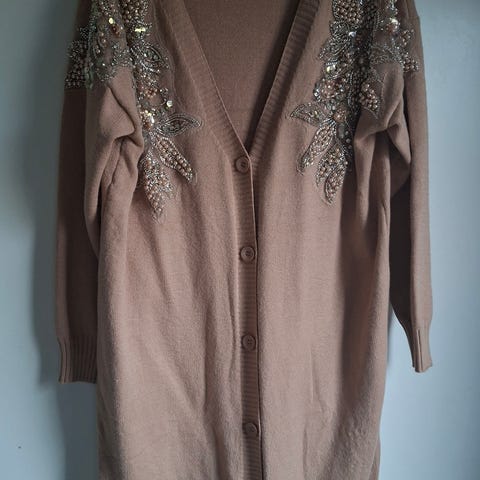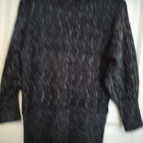 Poolokauluksinen hihaton pusero ja villatakki koristeluin. Puseron leveys kainaloiden alta n. 88 cm, villatakin korkeus selästä n 50 cm ja leveys n 100 cm.