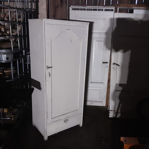 Vanha, erittäin jykevä, painava ja näyttävä vaatekaappi.