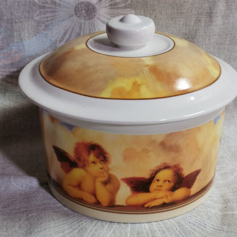Hopeinen suola ja pippuri -teline. Setissä hopeiset enkelit pitävät suola ja pippuri kuppia. Settiin kuuluu myös hopeiset lusikat molempiin kuppeihin.