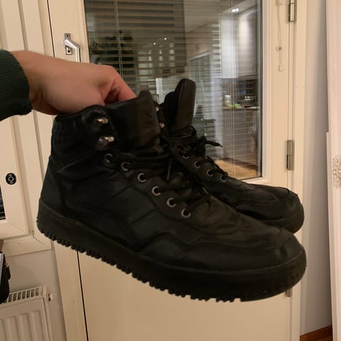 Myydään miesten kengät. Muuten hyväkuntoiset mutta kärjistä pinta irronnut. Koko 43. Hinta 3e.