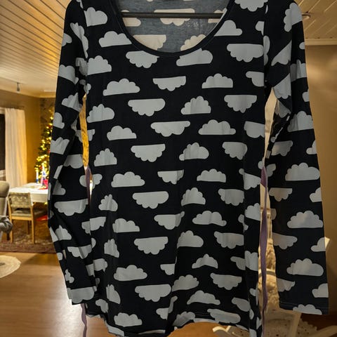 Ohut juhlapaita esim. bleiserin alle tai sellaisenaan pikkujouluihin tai muihin juhliin. Kauluksessa ja paidan keskellä menee satiininen tai silkkinen (?) kiiltävä raita. Hyväkuntoinen. 3/4 hihat.