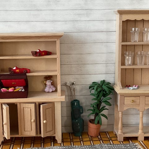 Keittiötavaraa enemmän ehkä Barbie-kokoiselle. Leikkuulaudat puisia, itse maalattu. Muut astiat muovia. Kaikki kerralla.
