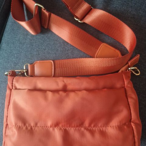 Myydään söpö pieni tekonahkainen käsilaukku säädettävällä hihnalla, varsin siistissä kunnossa.