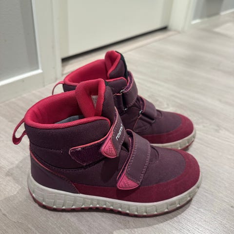 Reima lasten kengät koossa 32, väriltään vaaleanpunaiset. Kengissä on tarrakiinnitys. Pohjassa on Vibram-kumipohja, joka tarjoaa hyvän pidon erilaisilla alustoilla.