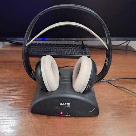 Vanhat, mutta melko hyväkuntoiset langattomat kuulokkeet lataustelakalla.
