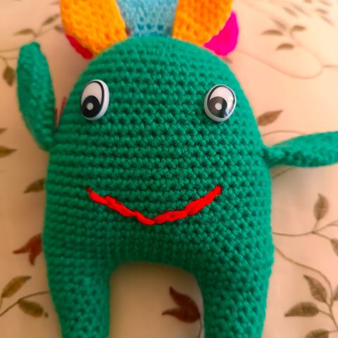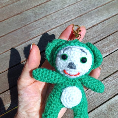 Hauska koriste käsilaukkuun tai reppuun. Käsintehty, virkattu. Täytetty keinokuitutäytteellä ja turvasilmillä.
