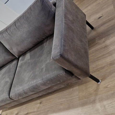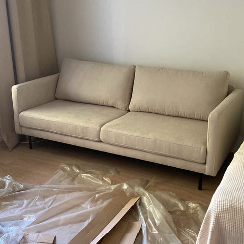 Upea uudenveroinen roosan värinen kolmenistuttava sohva. Mustat metallijalat. Kesällä ostettu, ollut vähäisellä käytöllä.