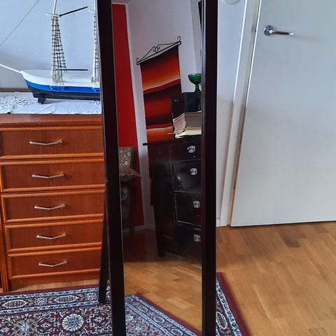 Painavahko pukeutumispeili, säädettävä. Pieni kuluma ei juuri näy. Yleisilme hyvin siisti. Tummanruskea, lähes musta. Kiristyy paikalleen sivunupeista. Laatikon nuppi ei ole paikoillaan, mutta tallessa- samoin ruuvi. Ostin jostakin Pohjanmaalta 15 v sitten.