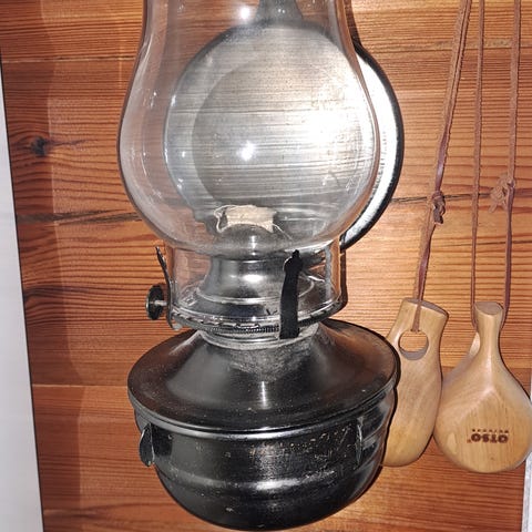 Suloinen pieni öljylamppu, lasirungossa punainen sydänkuvio.